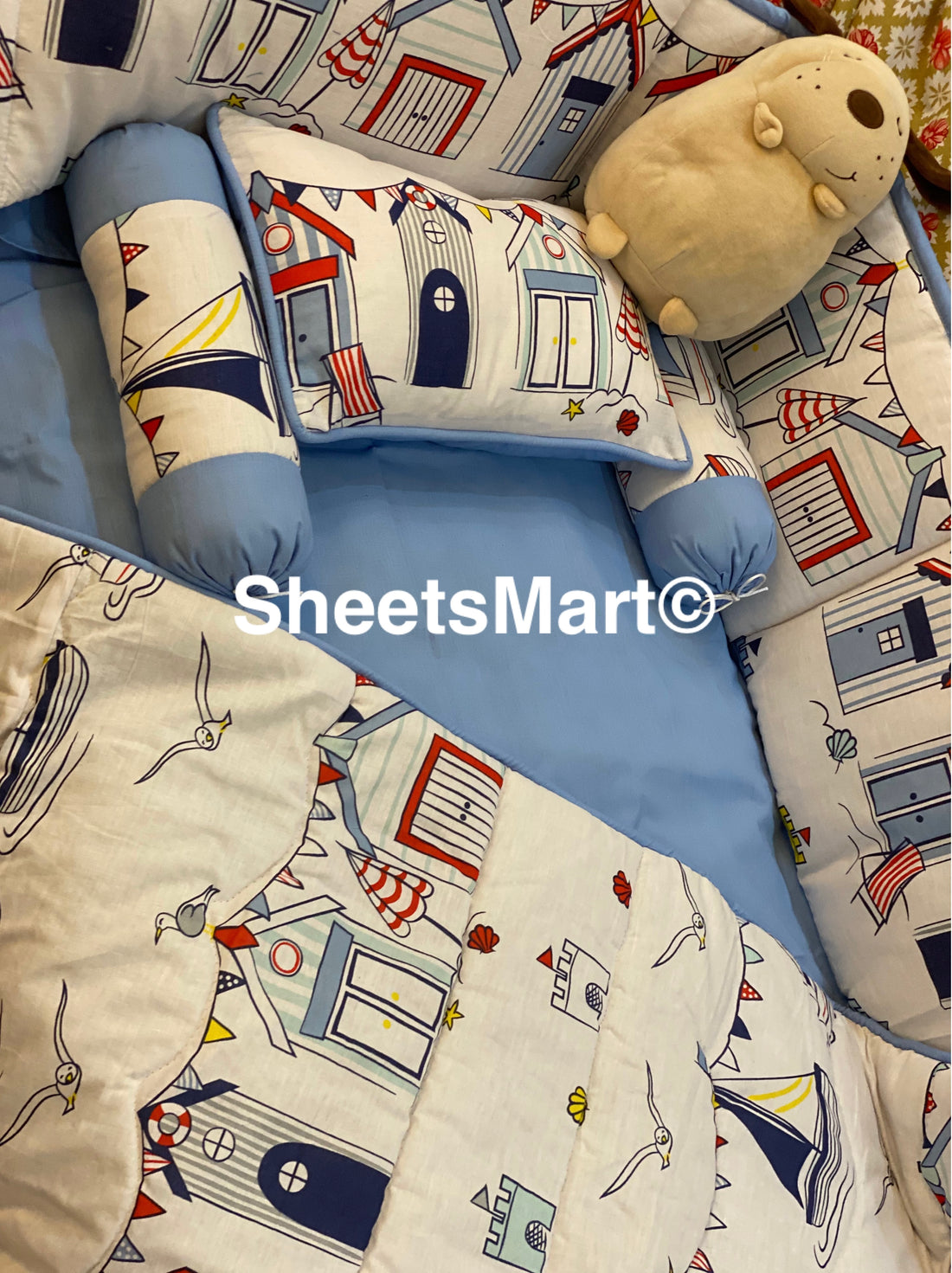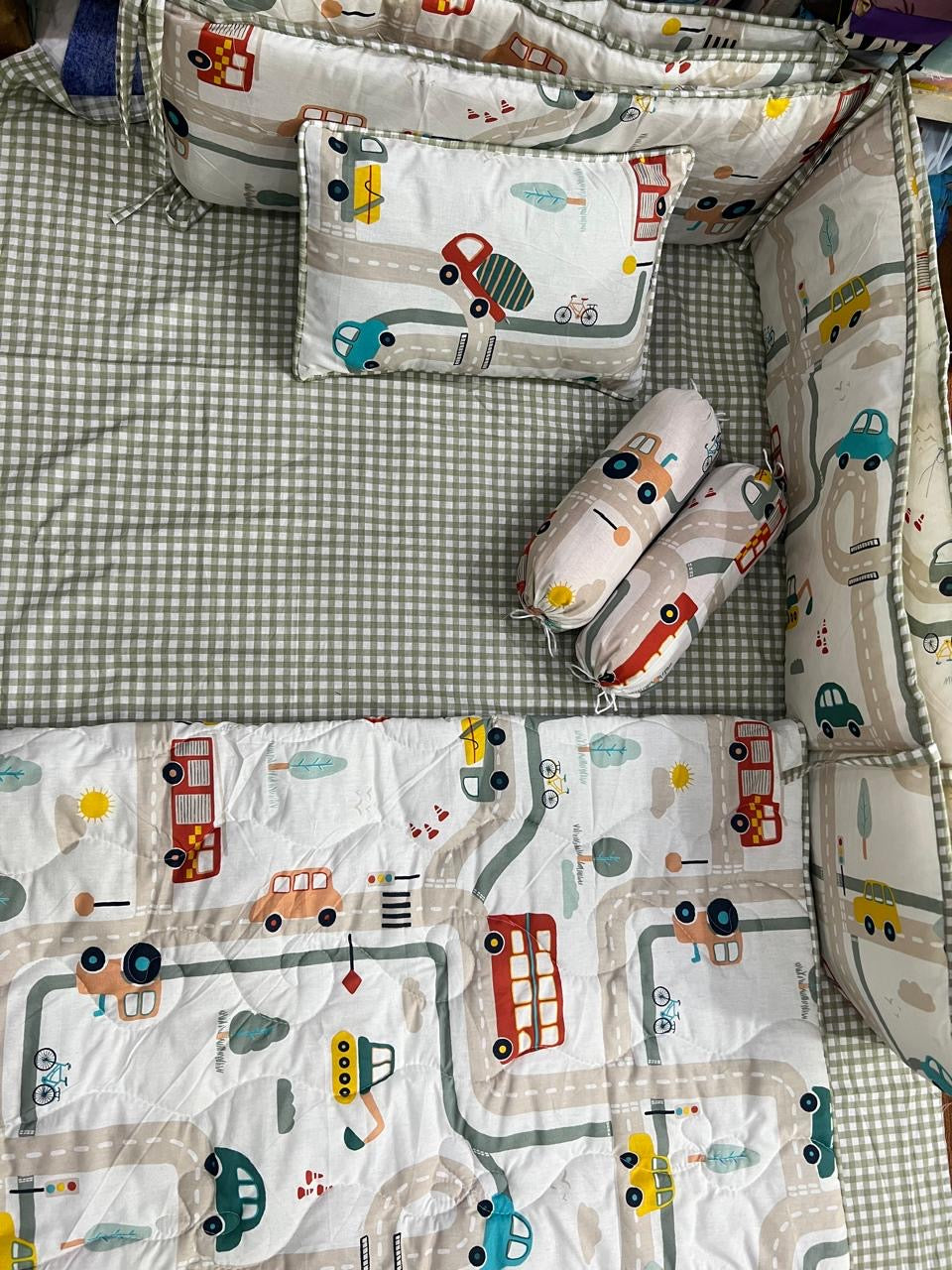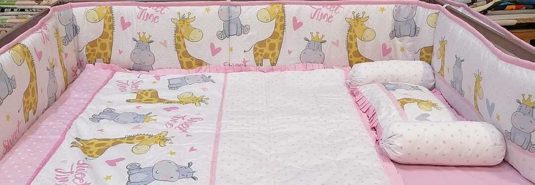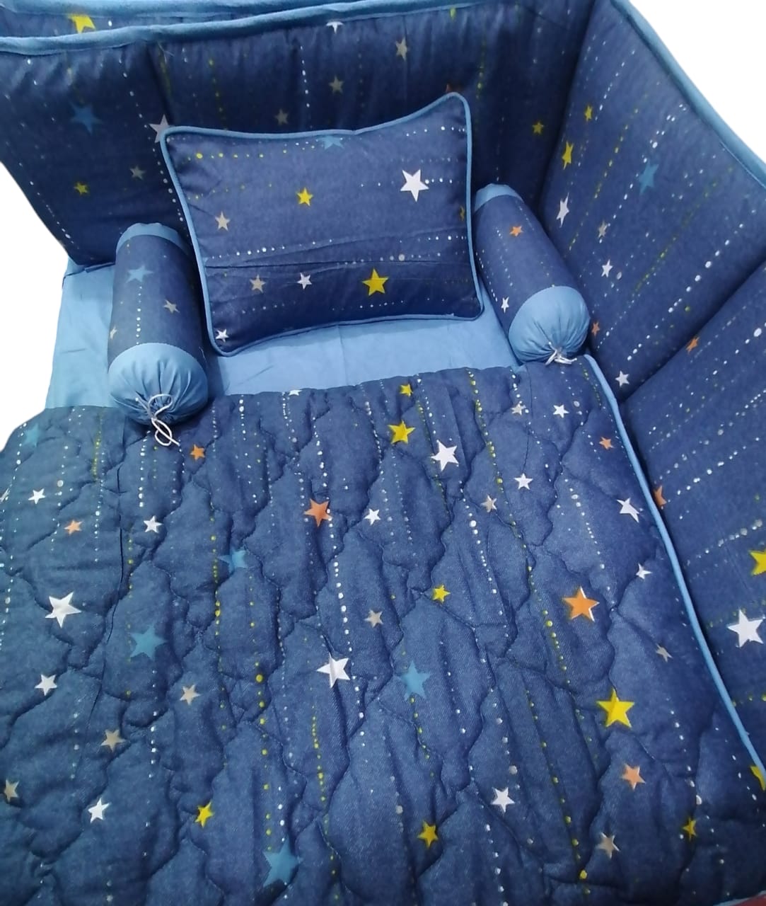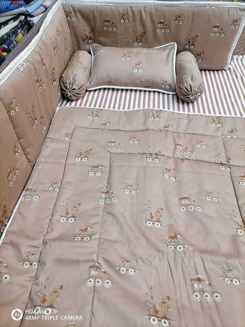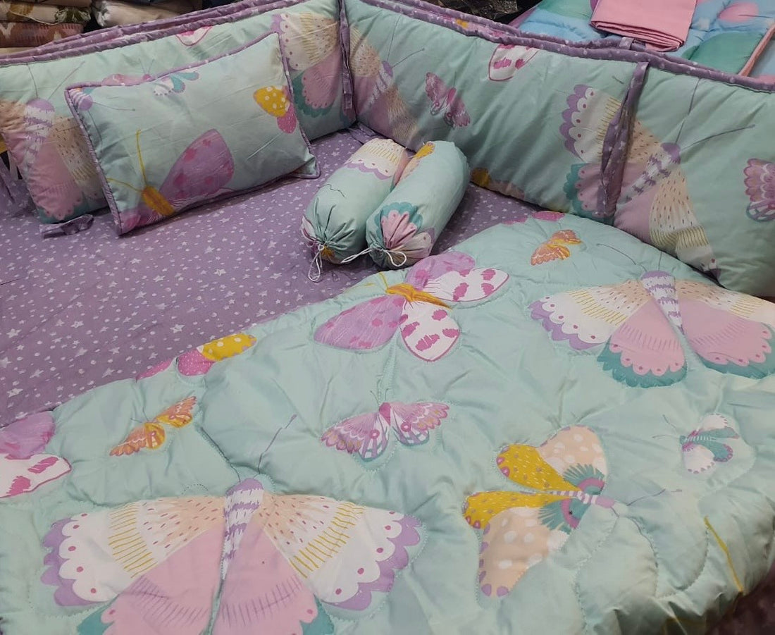 9 Piece Cot BeddingSet includes:1 Baby Pillow (with filling)2 Neck Rolls (with filling)1 Quilted Comforter...