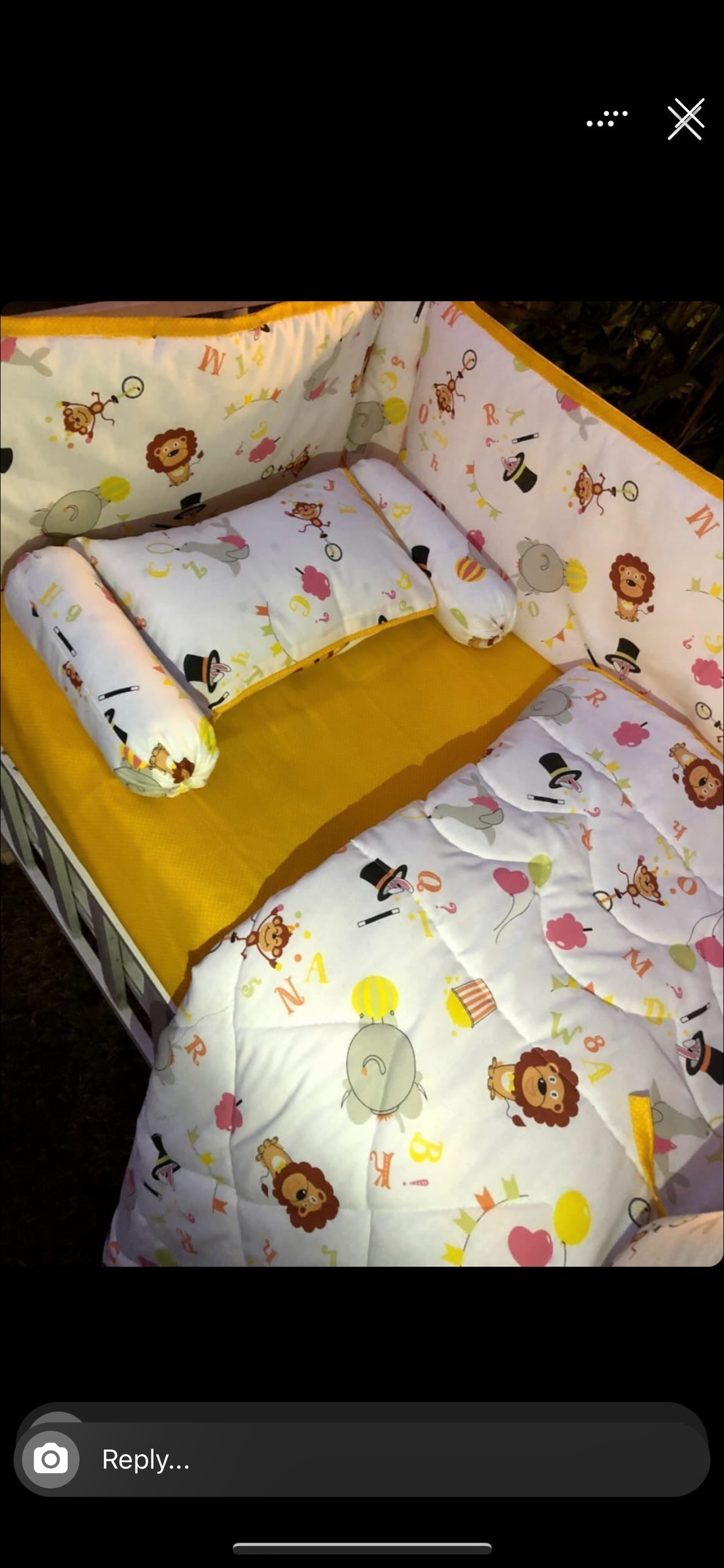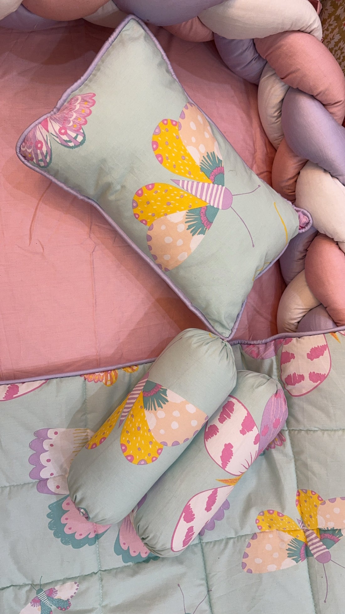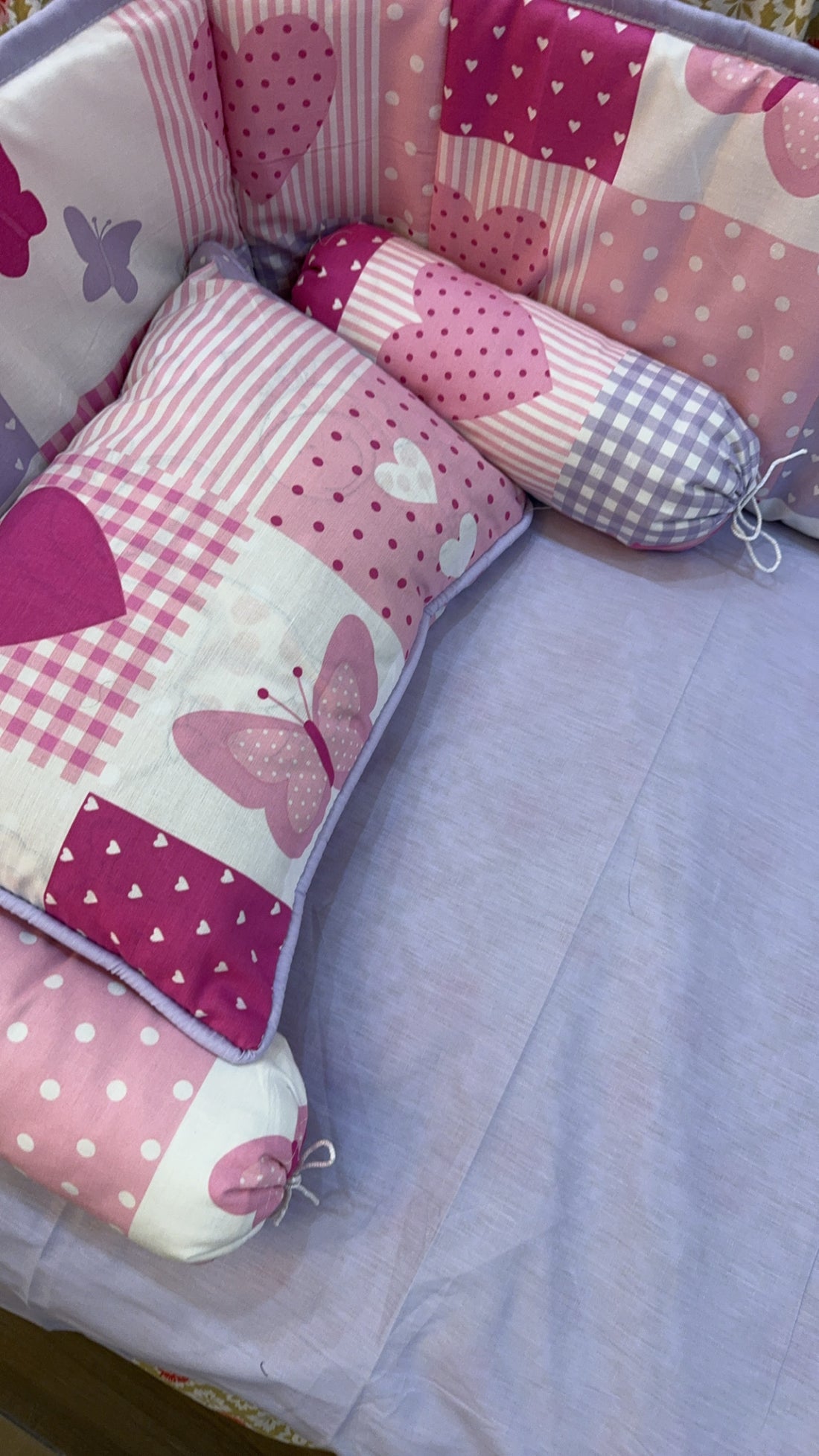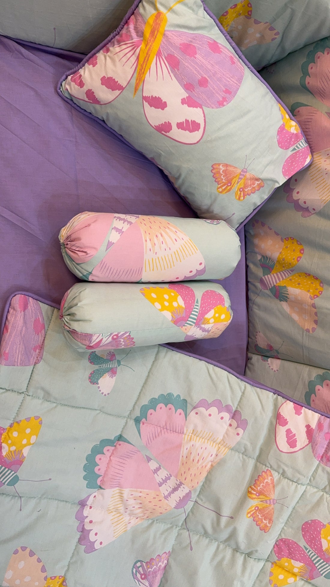 9 Piece Cot BeddingSet includes:1 Baby Pillow (with filling)2 Neck Rolls (with filling)1 Quilted Comforter...
