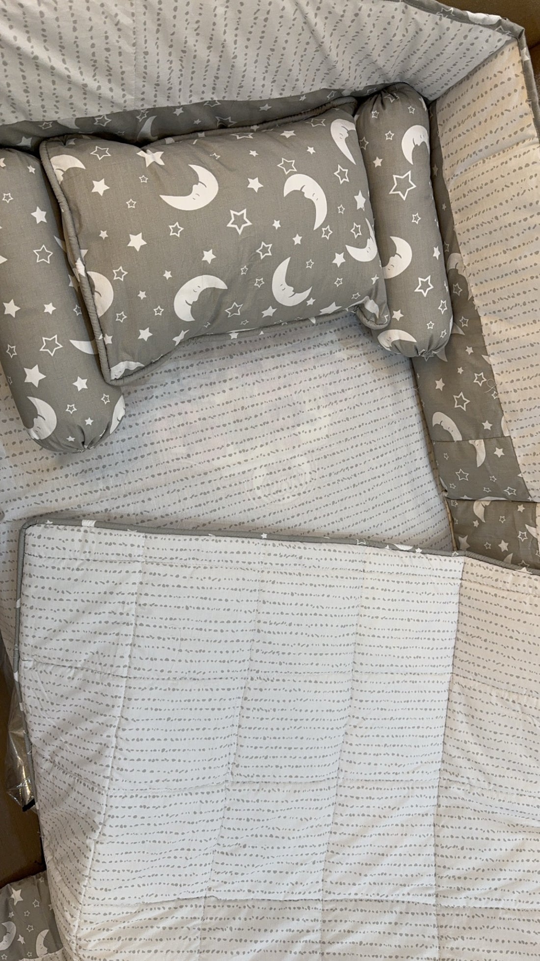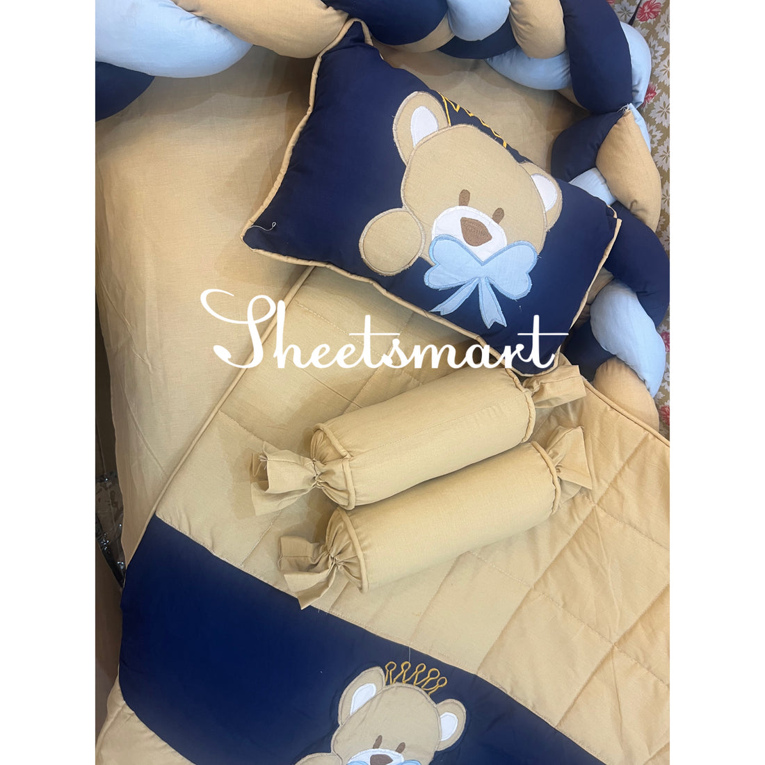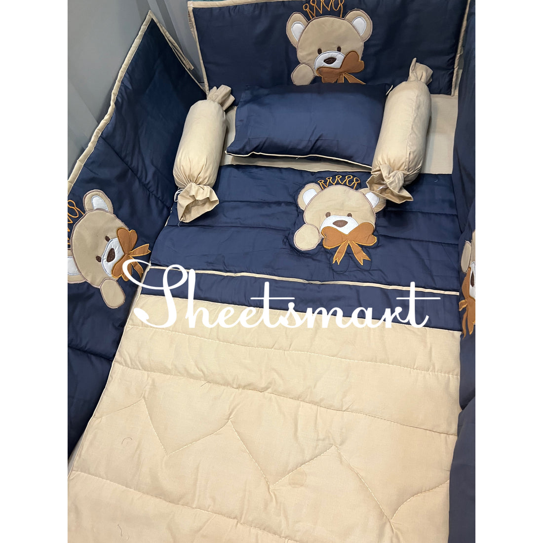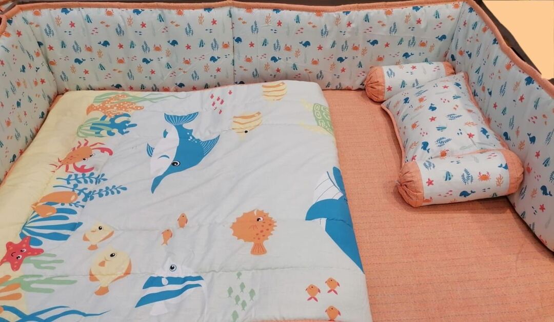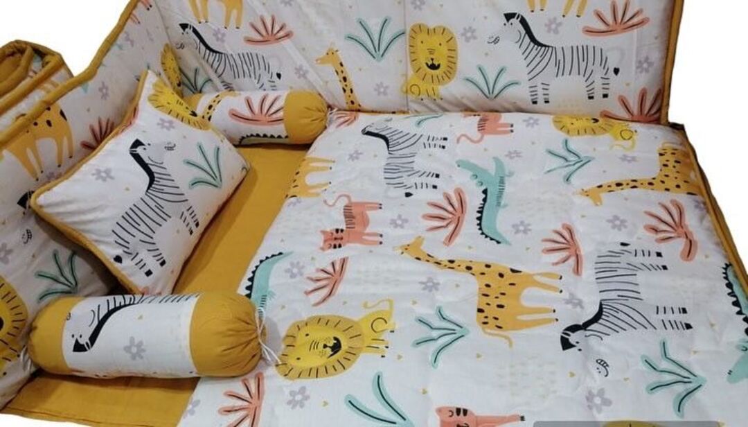 9 Piece Cot BeddingSet includes:1 Baby Pillow (with filling)2 Neck Rolls (with filling)1 Quilted Comforter...
