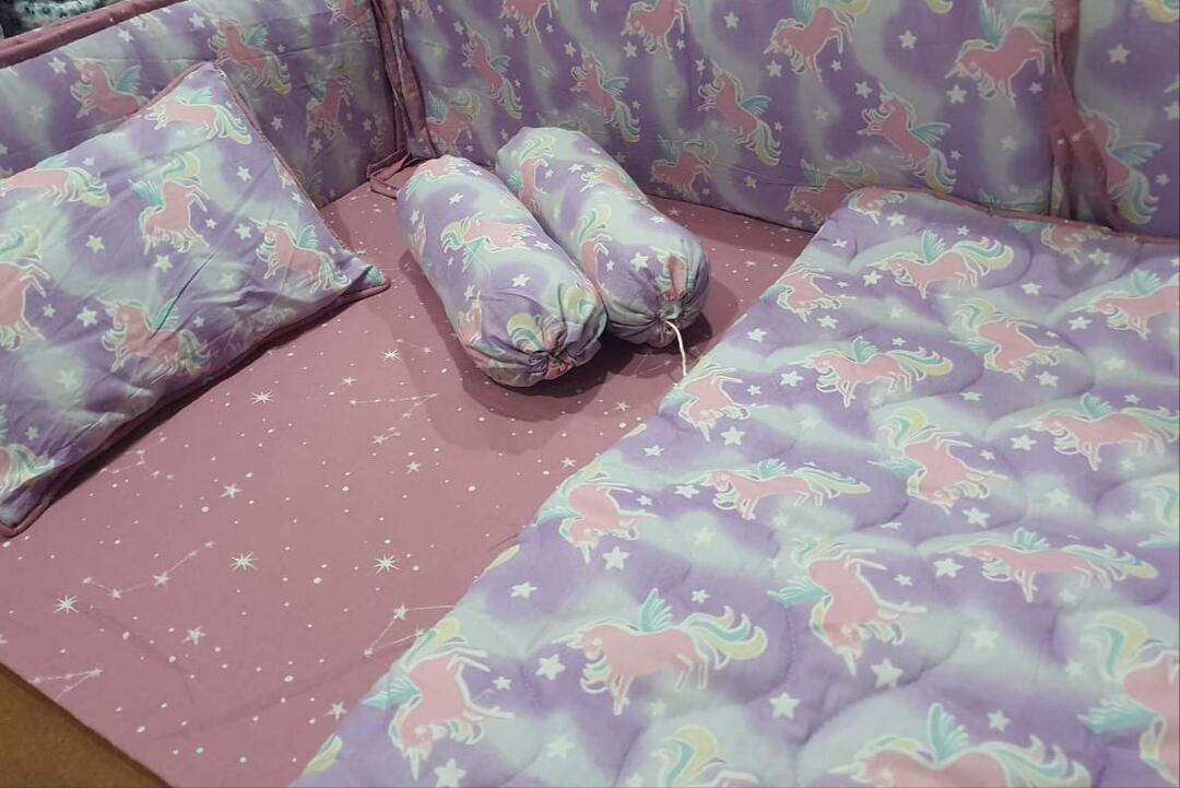 9 Piece Cot BeddingSet includes:1 Baby Pillow (with filling)2 Neck Rolls (with filling)1 Quilted Comforter...